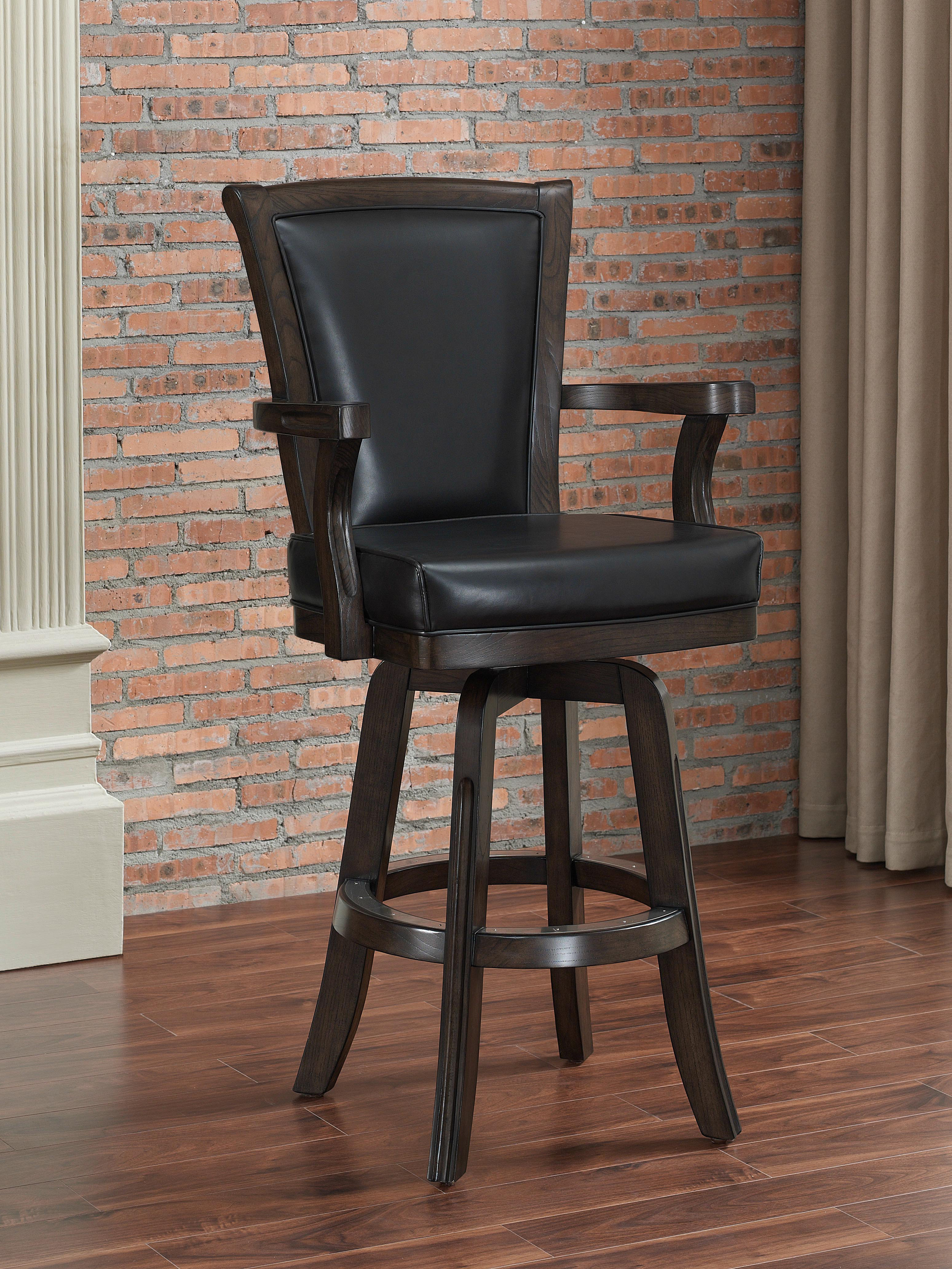 Finished in riverbank with a 4" java bonded leather cushion, the Auburn stool come as an assembled base and seat. It is built using mortise and tenon construction principles and features a 360° full-bearing swivel, webbed seating, and adjustable leg levelers