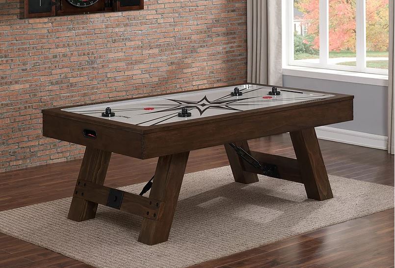 The Savannah Air Hockey table features a powerful single blower, manual scorers, an elegant, industrial design featuring a perfect combination of rustic-looking wood and steel turnbuckles