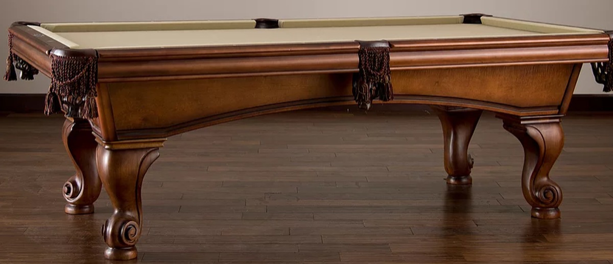 The soft Navajo finish of the Camden, combined with unique, subtle accents create an eye-catching look that will fit any decor. Featuring a beautiful maple veneer cabinet, maple rails with decorative blinds, robust Ram's head legs - and finished off with custom Suede fringe loop & tassle pockets, the Camden pool table has got it all!