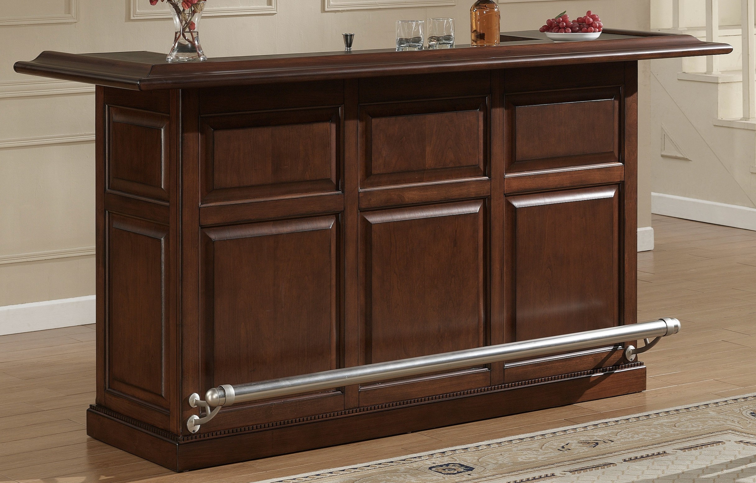 The Catania Bar is finished in Navajo with Brushed Steel accent hardware and raised panels for a beautiful, traditional design. It includes a foot pole, ice bucket and dual bottle wells, glass stemware holders, dual pullout wine bottle storage racks, plenty of storage shelving, locking cabinets and easy-glide storage drawers.
