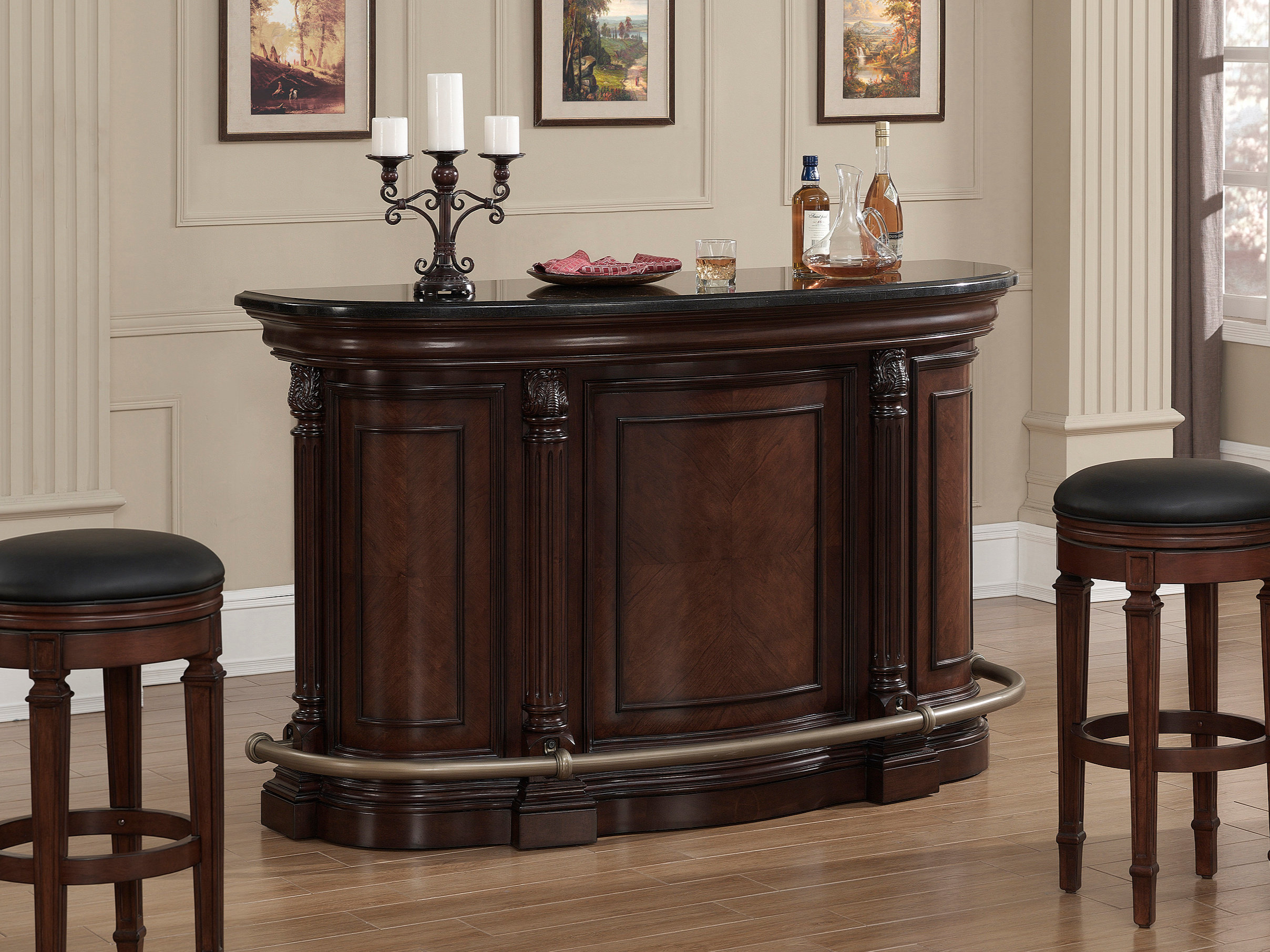 The Emilio Bar is finished in Chestnut with Antique Brass accent hardware and includes a beautiful granite top, decorative corbels and panels, glass stemware holders, storage shelving, locking cabinets and easy-glide storage drawers.