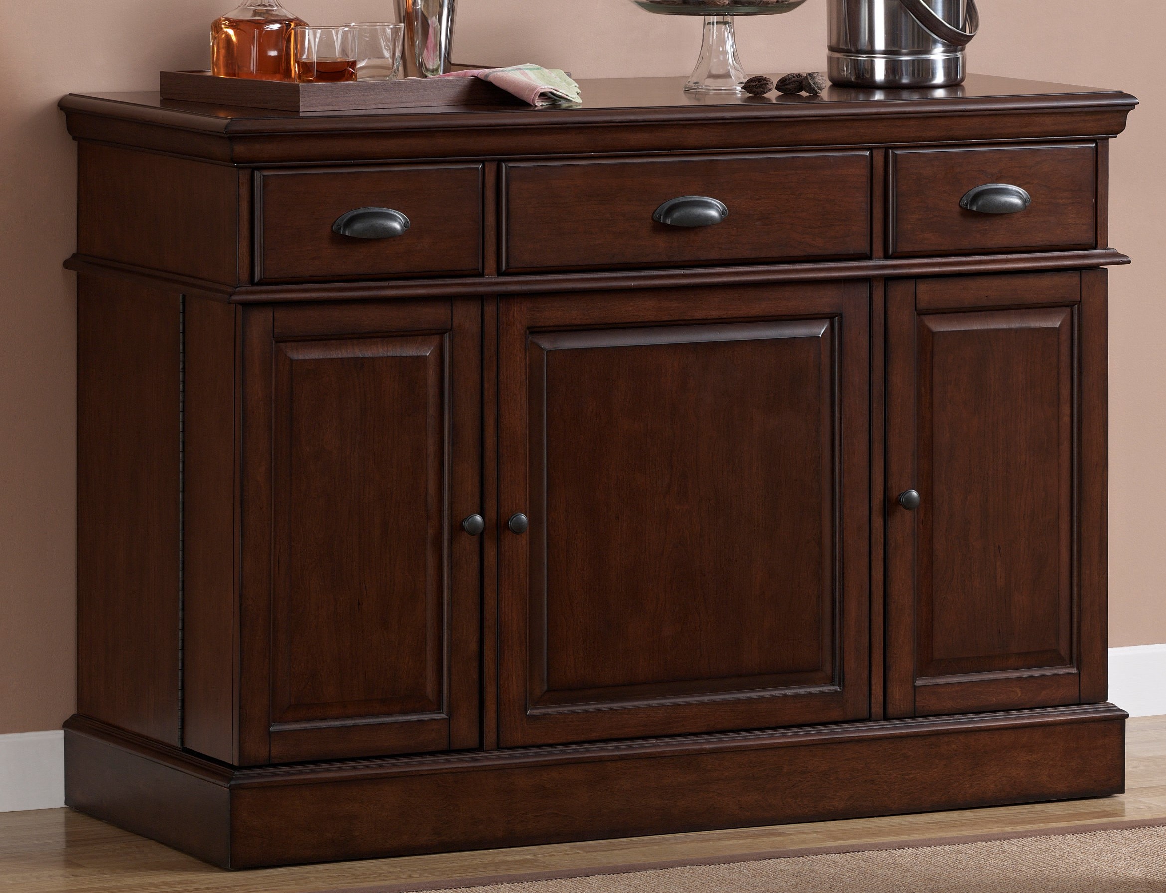 The Gabriella’s simplistic beauty combined with its convenient size make it the perfect functional accent piece for rooms of all shapes, sizes, and schemes. Finished in Navajo with Charcoal Bronze hardware, it provides huge storage benefits in a compact design by utilizing a mesmerizing Lazy Susan-style middle cabinet. Flanked by two other storage cabinets featuring premium Piano Door Hinges, the Gabriella can hold the life of the party and more! Three basic storage drawers with clamshell handles provide the finishing touch on this masterpiece.