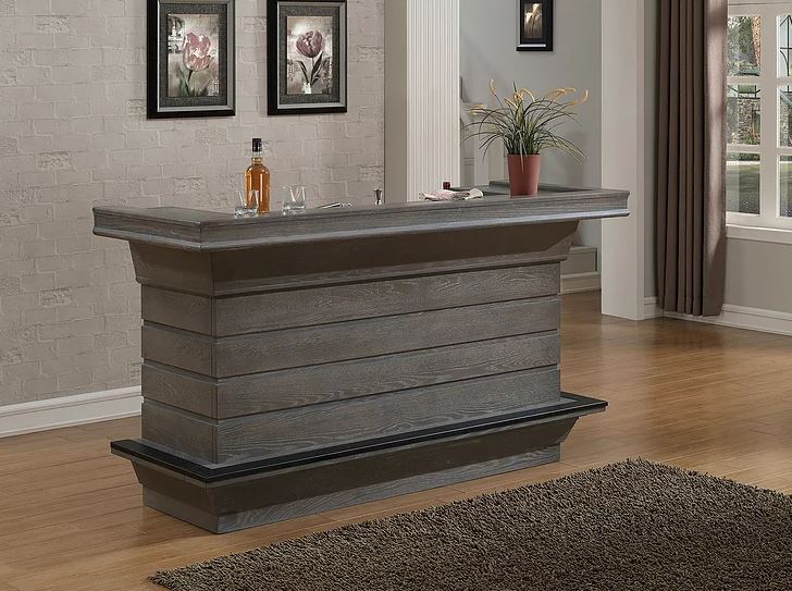 The Caliente Bar is finished in Glacier with Charcoal Bronze Accent Hardware. This stylish Oak bar features a removable Ice Bucket, Glass Stemware Holders, and plenty of Storage Shelving. With an Oak Veneer and Stone top and a Decorative foot rest, it's sure to be appreciated for its form and beauty. Features Locking Cabinets for added safety, and convenient Easy-Glide Storage Drawers.