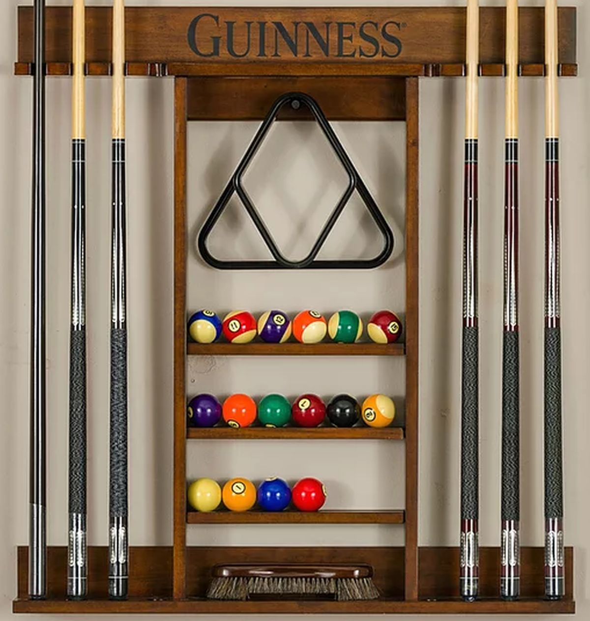 The Guinness Rack can easily hold up to 8 cues while also housing ball racks, balls, brushes, and any other billiard accessories you may need handy; all at a terrific price.