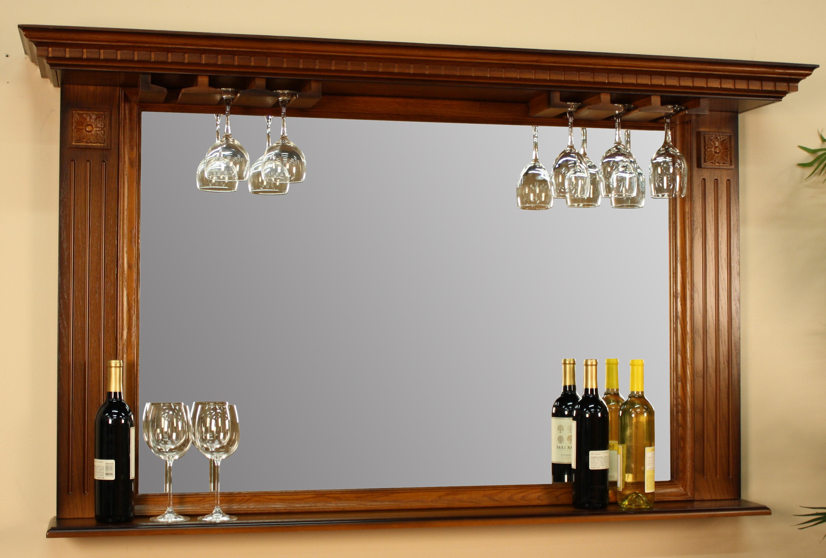 The 60" Kokomo Bar Mirror comes finished in a beautiful Vintage Oak, requires consumer assembly, and features glass stemware holders, a beautiful beveled edge mirror, and a convenient storage shelf.