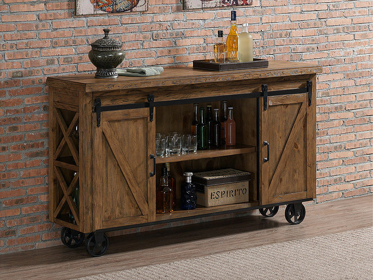 The Gateway Bar Cart, made of pine, is the perfect accent piece to any home looking for a fun eating or drinking companion! Its industrial design and sliding barn doors allow it to take on multiple looks while providing excellent functionality and plenty of storage space. It even has a hole underneath the middle shelving unit for any cords so it can be used as an entertainment stand. Never party without it!