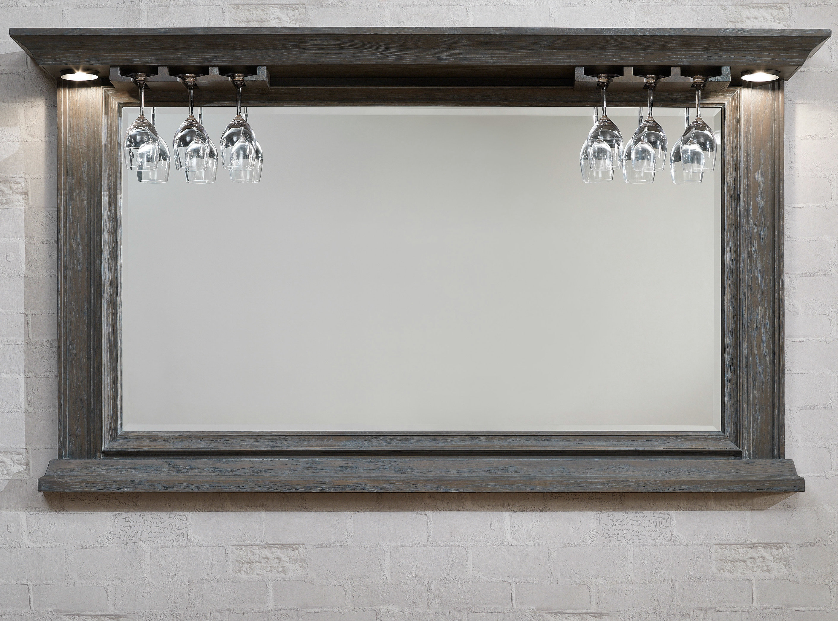 The 68" Riviera Bar Mirror finished in Glacier requires Consumer Assembly and features Glass Stemware Holders, a beautiful Beveled Edge Mirror and Accent Lighting