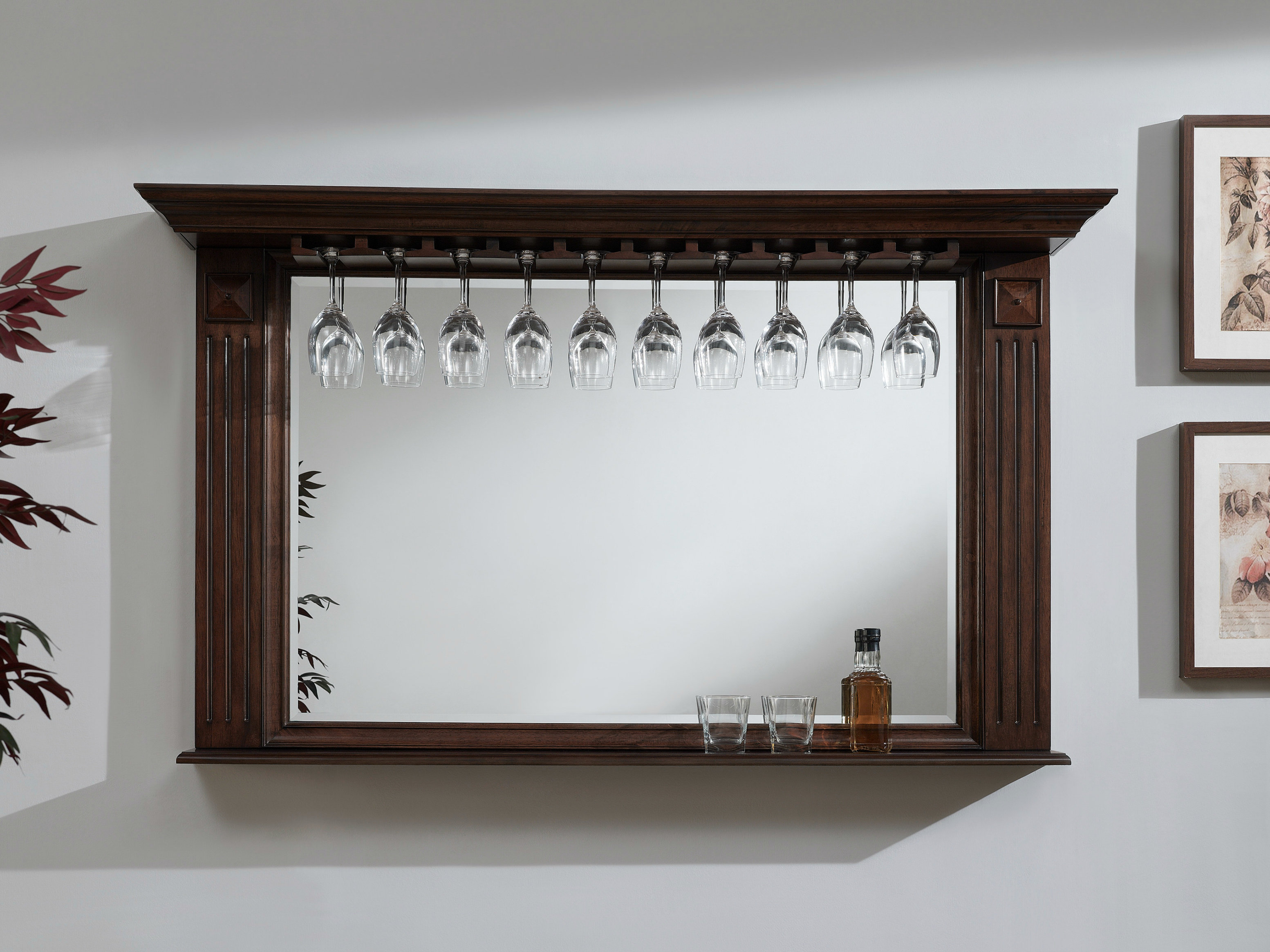 The 60" Roma Bar Mirror finished in sable requires consumer assembly and features glass stemware holders, a beautiful beveled edge mirror, and a convenient storage shelf.
