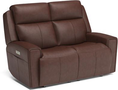 Our DualFlex Spring System ensures a mix of flexibility and firmness, while ergonomic elements including a waterfall chaise and generously sized contoured seat keep your legs and lower body comfortable for as long as you'd like to sit. Both sitters can independently adjust the headrest, recline and lumbar with a convenient power control in either arm, easily transitioning from an upright to fully reclined position and keeping the back supported. A USB port in the power control makes it easy to keep devices charged, while a handy side pocket gives you a place to store remotes. And thoughtful details, including wide track arms with top-stitching and welt trim, give the loveseat a tailored aesthetic. Barnett is upholstered in our premium top-grain leather, ensuring this loveseat will look good for years to come.