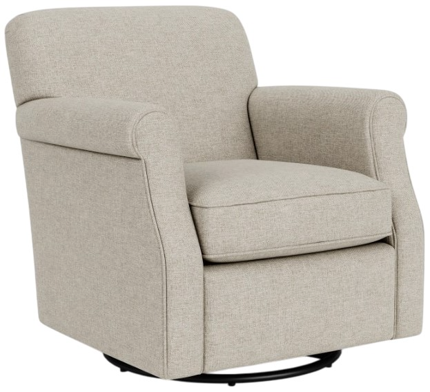 Mabel's simple structure gives way to a rounded tight back cushion and traditional rolled arms. Welt cording outlines the arm fronts and seat cushion for a clean look, and its ability to swivel makes it an irresistibly fun, casual piece.Read More