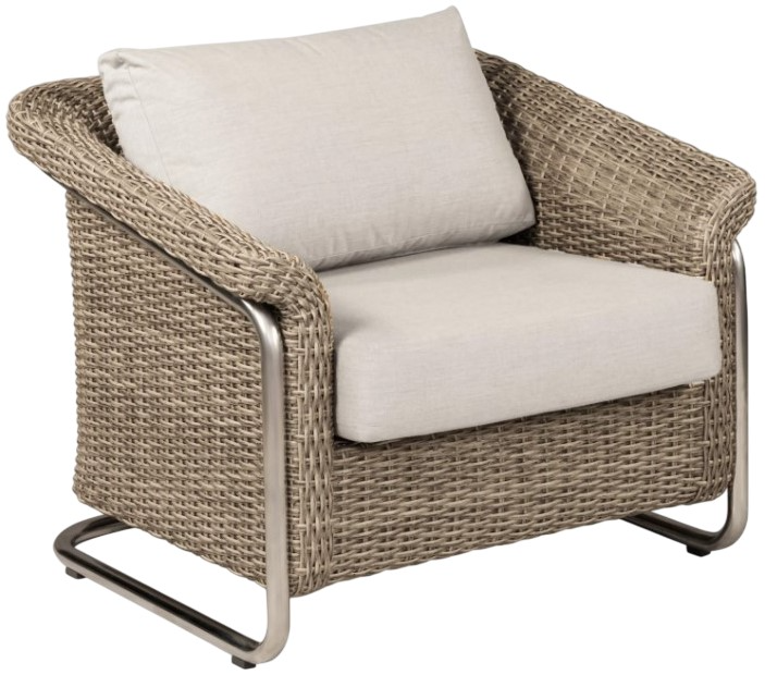 The warm gray wicker, stainless steel frame and Sunbrella performance fabric upholstery provide weather-resistance for year-long enjoyment.