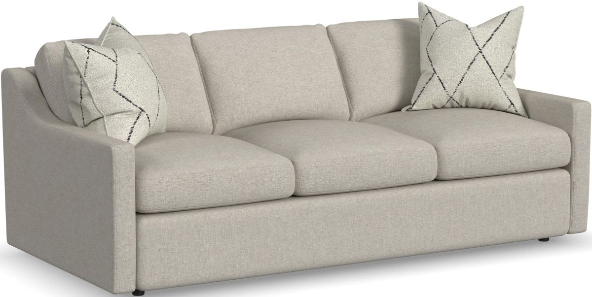 A contemporary silhouette with soft, sloped arms and recessed legs