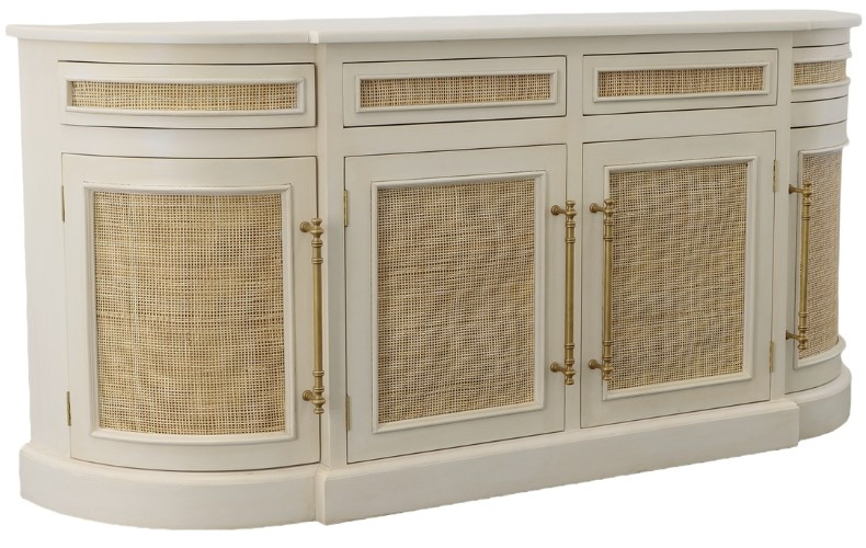 This simply stunning server has a secret! The horizontal panels above the doors are actually hidden drawers! Constructed of solid mahogany, this curved server is painted a soft satiny cream. Golden contrast is provided by woven caned panels and gleaming brass turned door handles.Read More