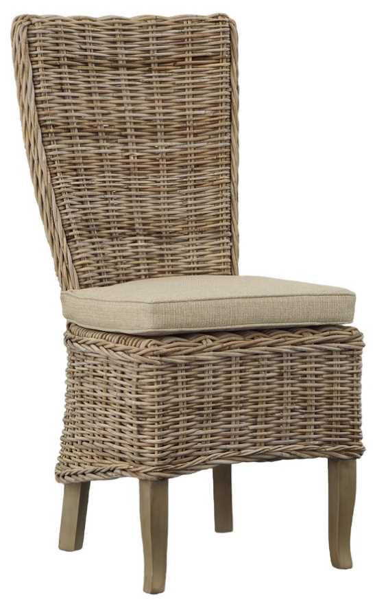 Welcome your guest to the table with this beautiful high back dining chair. Featuring intricately woven kubu on a plantation grown mahogany frame, this chair is finished in a driftwood color and comes with a cushion for added comfort.Read More