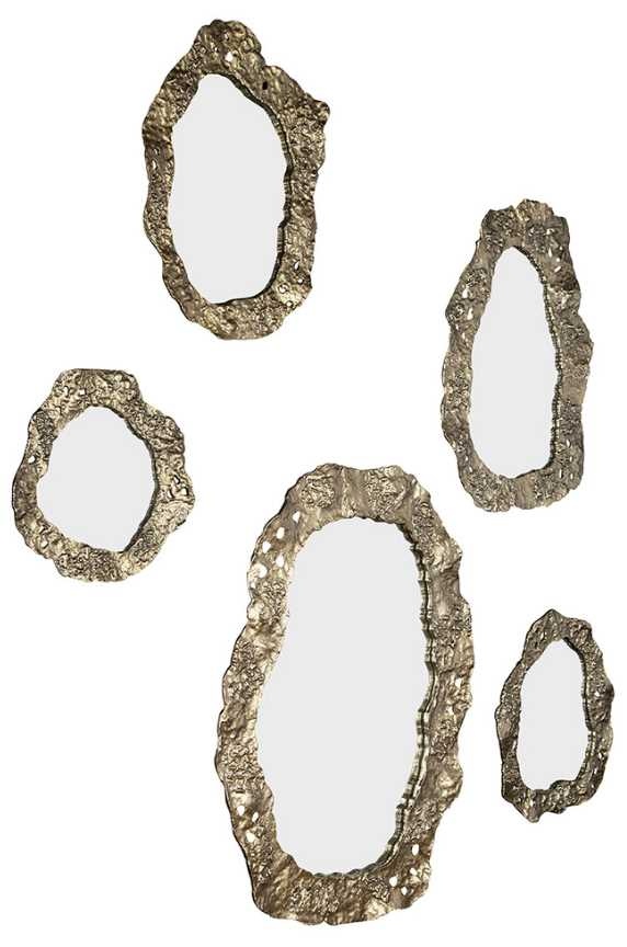 Organic in shape and reminiscent of oyster shells, this hand-cast iron 5-piece set of mirrors is beautifully finished in antique gold. It is fun to cluster as a group or use individually.Read More