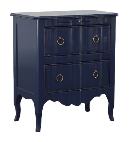 Perfectly scaled to use in pairs, this handsome mahogany chest is finished with lustrous satin blue paint which highlighted by the use of solid brass ring pulls. Not just a pretty addition to any room, this chest provides easy access to items stored within its 2-side hung full extension drawers.Read More