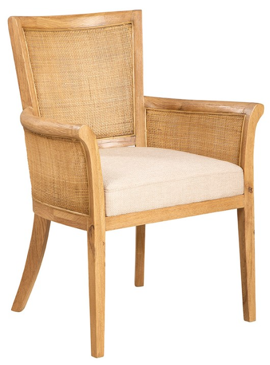 Crafted from a solid wood frame, this chair boasts a light brown finish that effortlessly complements any decor. The woven back and arms add a touch of elegance and additional comfort, while the linen cushion ensures a cozy seating experience.Read More