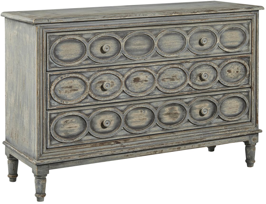 It is said that accent furniture is the jewelry of the room, and this three drawer pine chest, featuring link detailing on the drawer fronts certainly qualifies! Picture frame moldings, and the complex mid-tone blue finish, with a rub through to soft grey and warm wood tones, further highlight this jewel of a chest