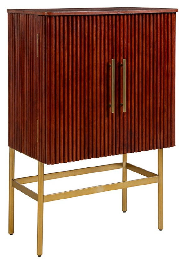 Introducing the Ricky bar cabinet, a true standout piece that redefines elegance and sophistication. Its rich wood exterior, featuring striking ridges, exudes a radiant glow that captivates the eye. The gold legs and handles create a beautiful contrast against the wood finish, adding a touch of luxury to the designRead More