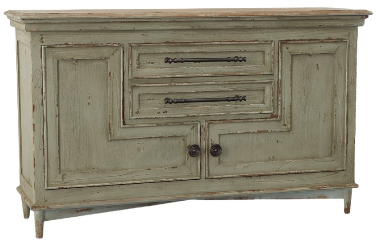 Subtly curved to add even more visual charm, this commodious sideboard features a practical adjustable shelf behind its uniquely routed doors. The solid mahogany frame is enlivened by the application of a lightly distressed cream finish. The quiet beauty of this sideboard is emphasized by the distinctive brass pulls.Read More