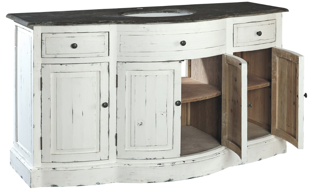 Charming storage for all of your bathroom needs is provided by this rubbed-white vanity with a shaped edge bluestone top. Behind the curved center doors is a curved removable shelf, coupled with removable shelves behind each side door.Read More