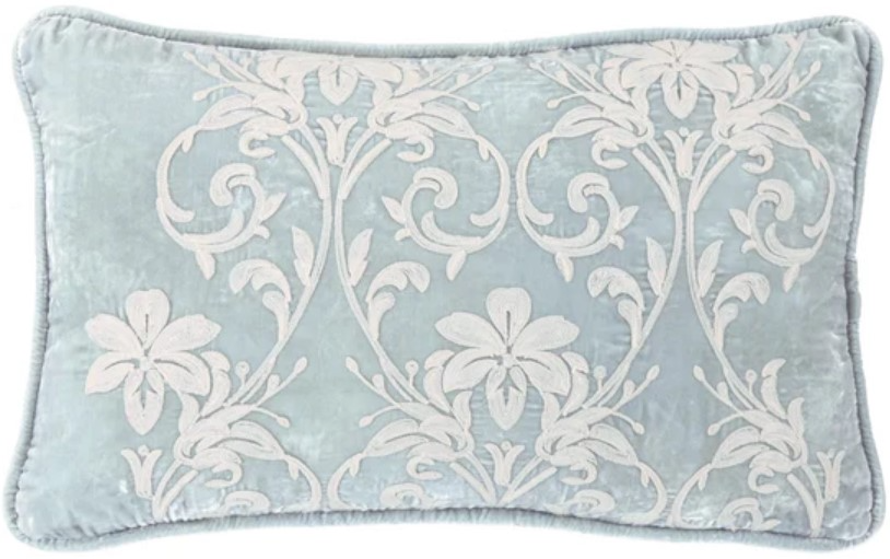 Adorn your bed with the soft heather blue tones and detailed crewel embroidery of this Belle Floral Embroidered Velvet Lumbar Pillow. This accent pillow features washed velvet fabric for exquisite softness, decorated with dancing floral and scroll elements for an elegant, decorative flair.Read More