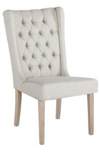 Chair's seat and seat back are upholstered in an off-white colored linen, cotton and polyester blend fabric