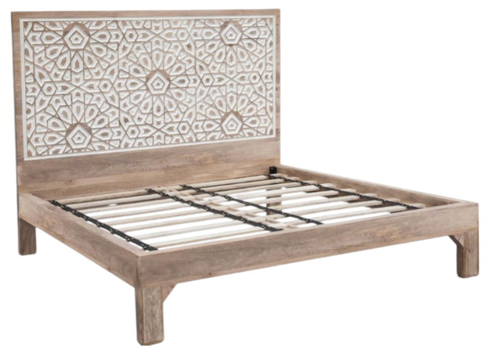 Headboard features a tribal geometric carving by experienced artisans in the wood, accented with natural white lacquer