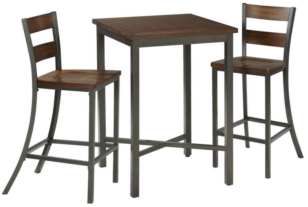 Our Cabin Creek collection conveys a reclaimed wood vintage feel. The Cabin Creek 3-Piece Bistro Set by homestyles is constructed of mahogany solids and veneers in a multi-step chestnut finish. The hand-distressing provides a unique one-of-a-kind look. Each piece has a hammered metal design on the frame. This set includes a bistro table and two bar stools. The table legs are fitted with nylon glides for protection and stability. The bar stools feature dual panel backs and contoured seats for comfort.