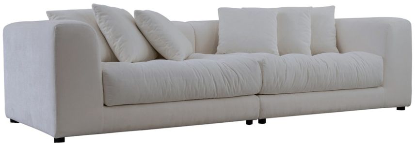 Plush cushions feature a foam core wrapped with feather and fiber