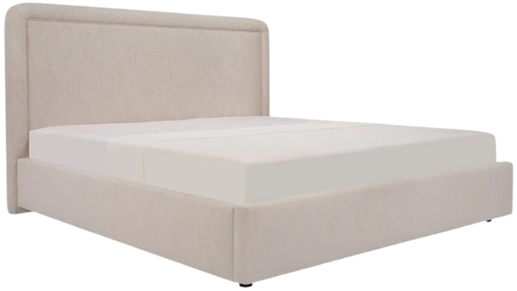 A bed with a hidden trick. The Simon bed features a rounded silhouette with piped detailing, upholstered in flecked beige polyester for softness and durability. The full footboard pulls forward to reveal storage divided into two panels, keeping essentials organized without clutter.Read More