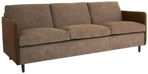 A little retro, a lot modern. The Teller Sofa mixes flecked polyester upholstery with top-grain leather wrapping the arms and back for tonal brown contrast. Foam, fiber, and faux feather fill cushions keep the sit plush yet supportive, while slim rubberwood legs lift the frame with mid-century ease.Read More